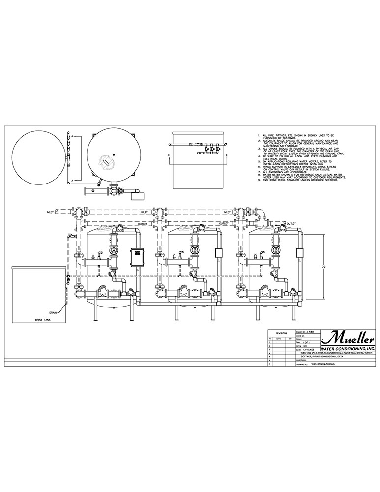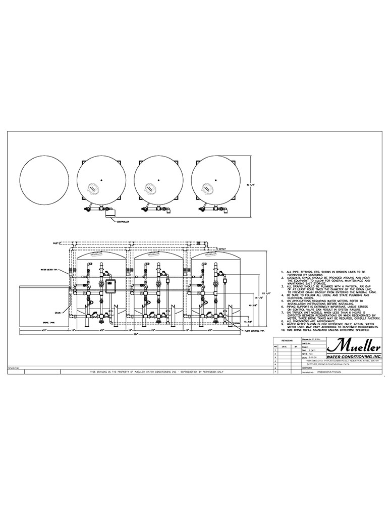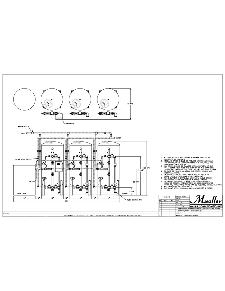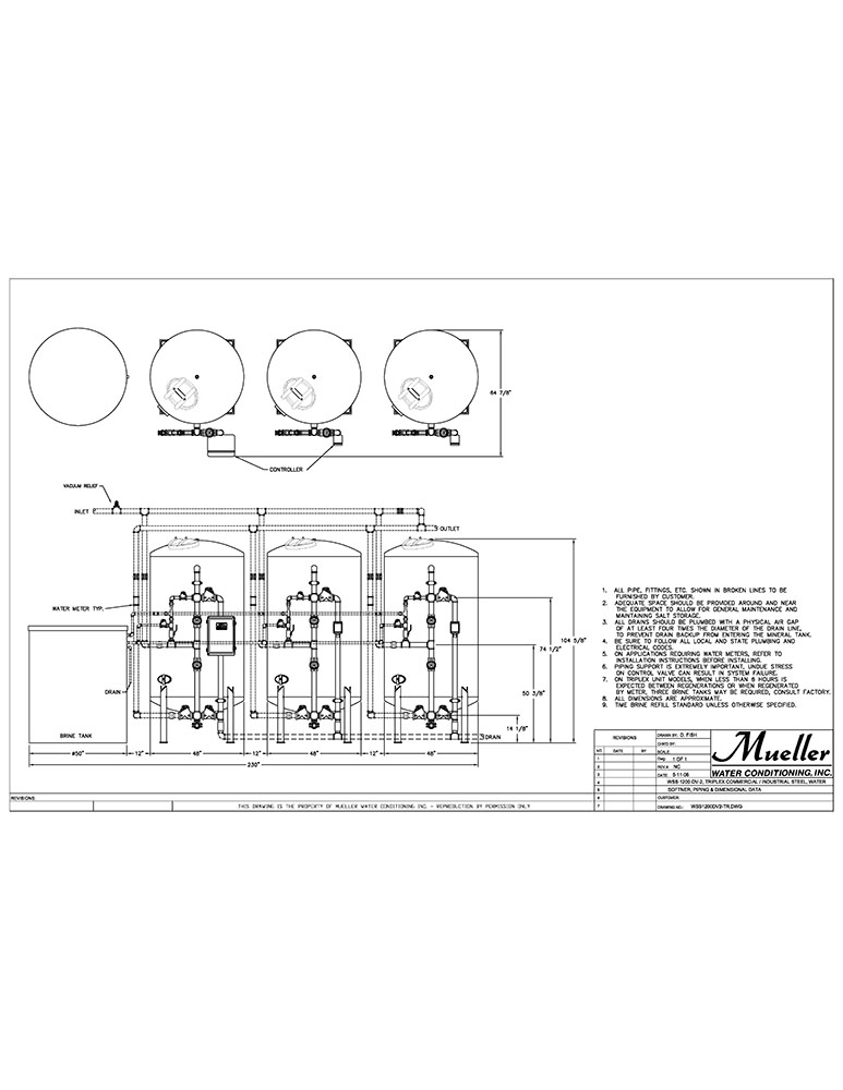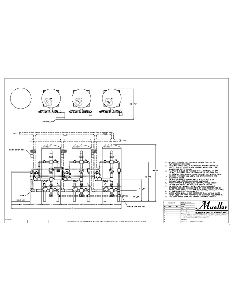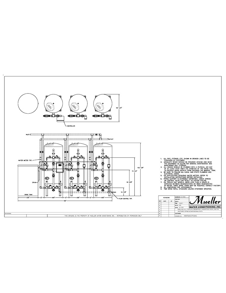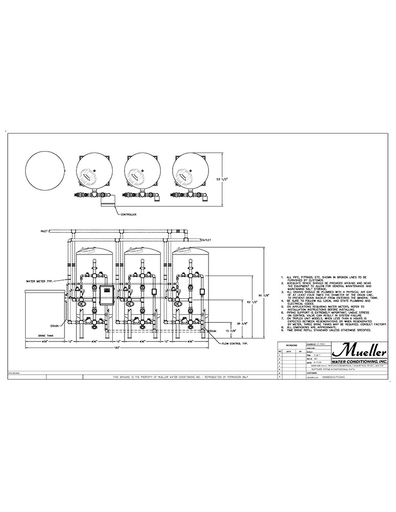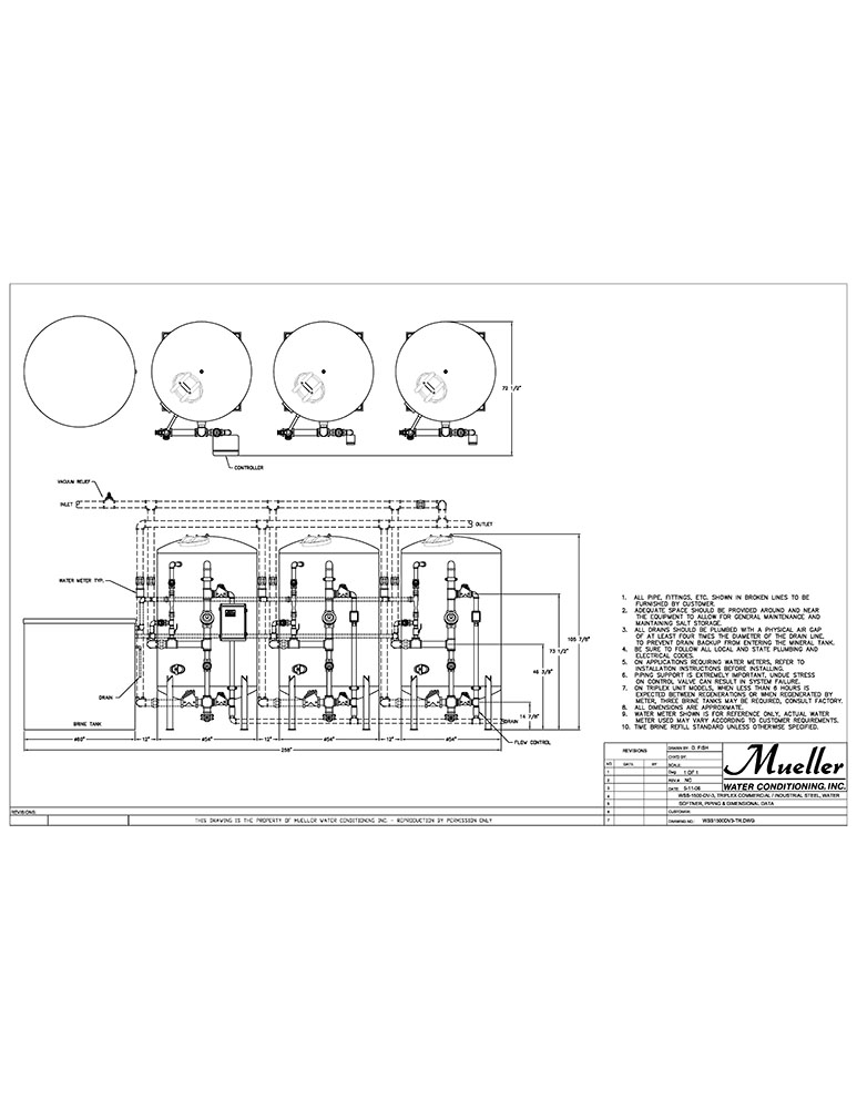 Drawing-Steel series softener, 1,500,000 grain exchange, triplex model, 3" inlet/outlet